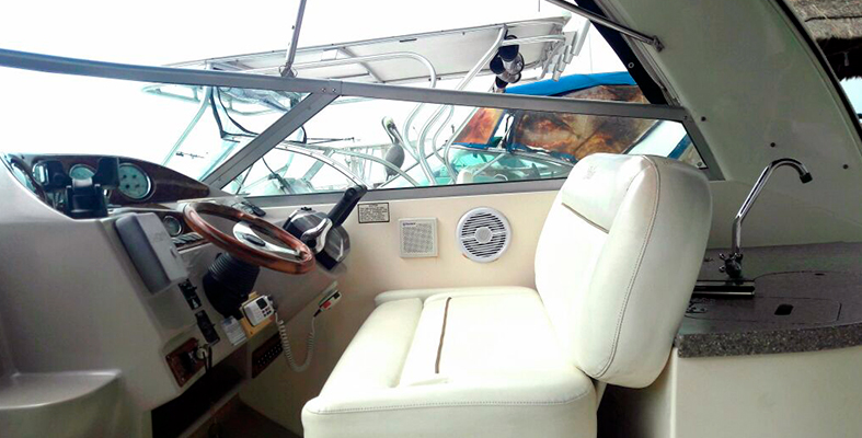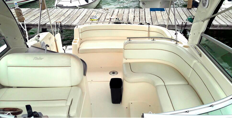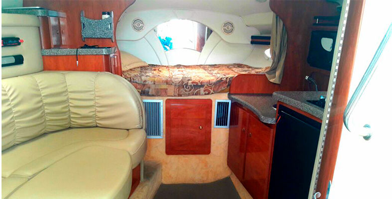 Este yate de lujo Rinker de 33 pies, cuenta con 1 camarote y 1 baño, una cocineta y una sala de media luna en la cubierta cuenta con espacio para acostarse en frente y atrás para sentarse.